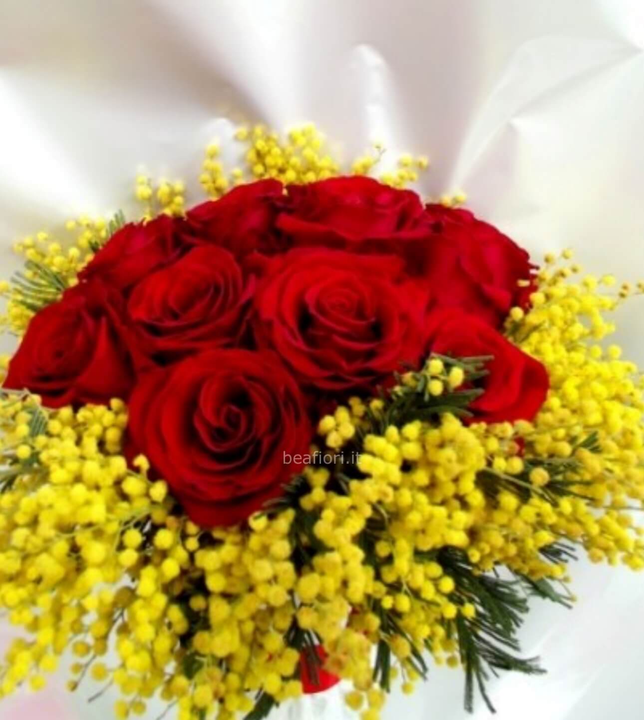 12 rose rosse gambo corto più mimosa